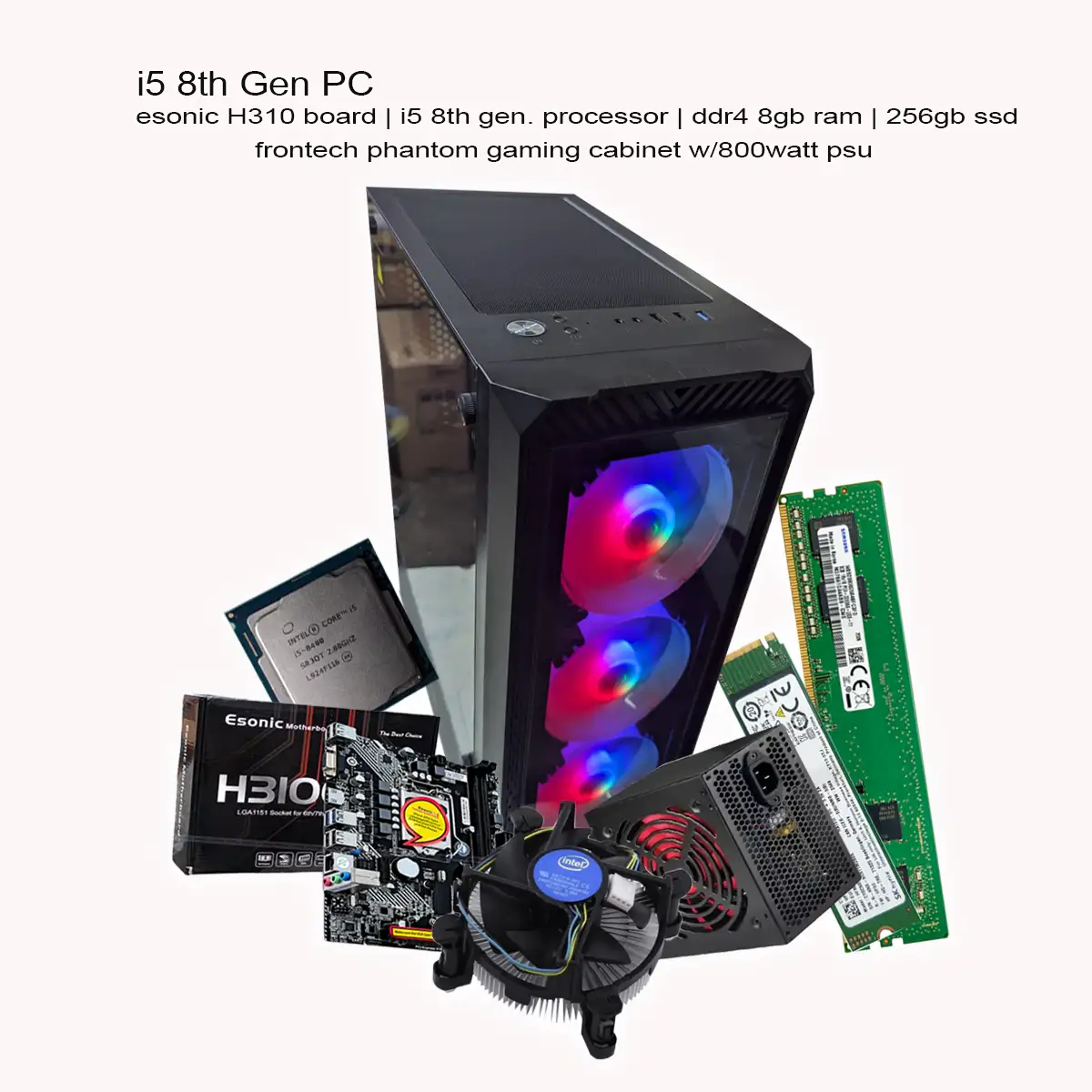 Powerful i5 8th Gen Desktop PC with 8GB DDR4 RAM and 256GB SSD for ultra-fast performance. Built with Esonic H310 motherboard and stylish Frontech Phantom RGB gaming case with 800W PSU, this PC delivers smooth speed, reliable performance, and a premium gaming look—perfect for office work, study, browsing, and light gaming.